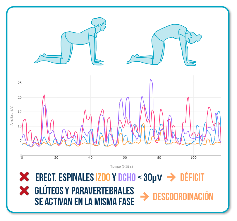 - – Glúteos y paravertebrales activándose simultáneamente sin control de fase → descoordinación.