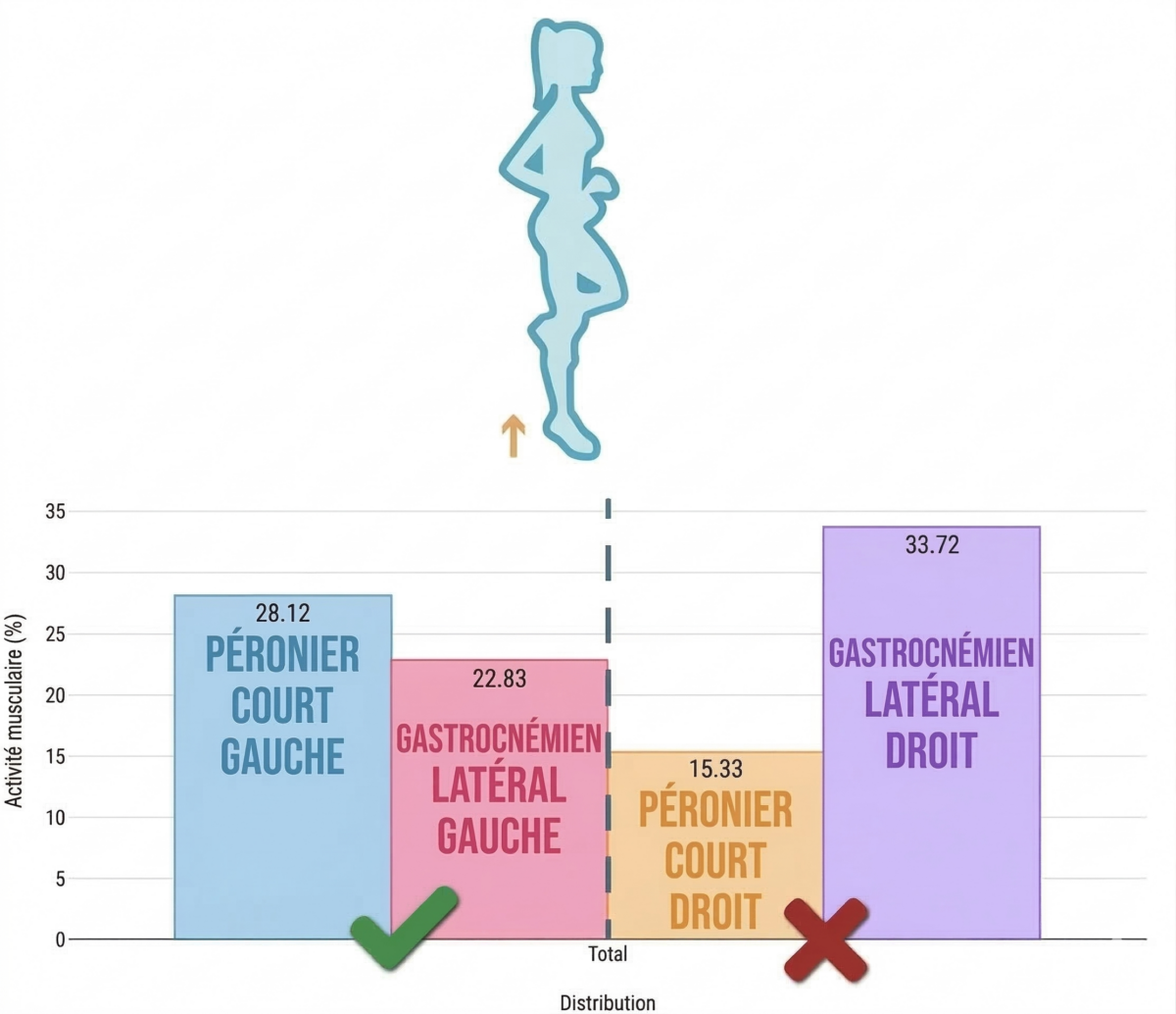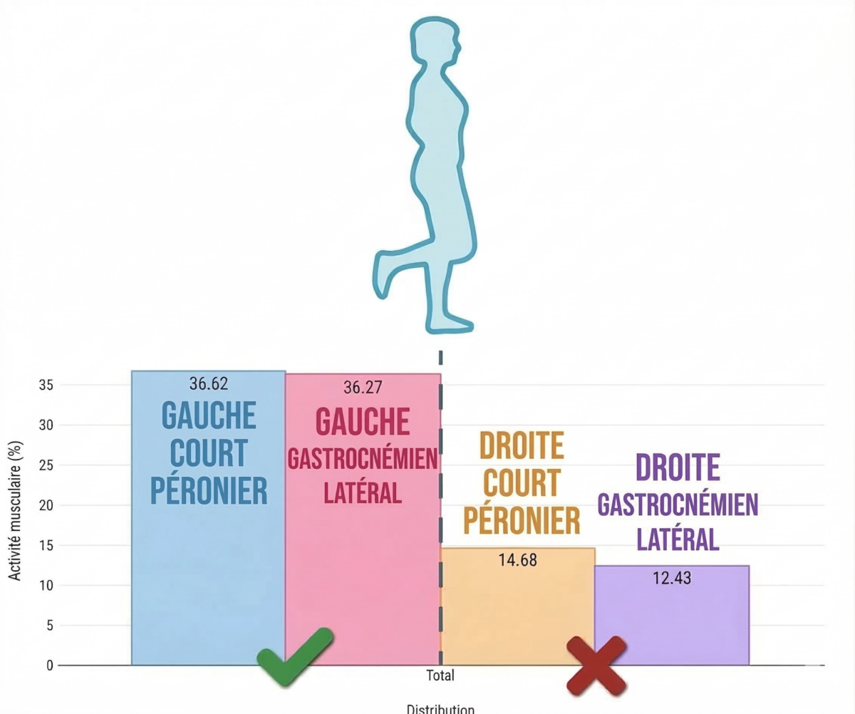 C’est ici que le premier résultat important apparaît : le court fibulaire droit montre un déficit d’activation, accompagné d’une participation réduite du gastrocnémien latéral.