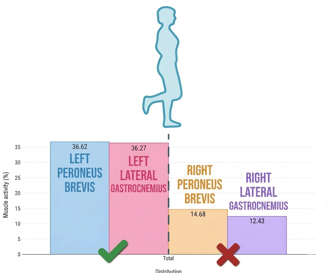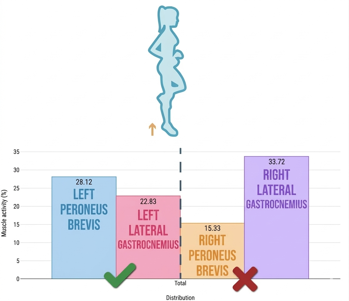 Here the first relevant finding appears: the right peroneus brevis shows an activation deficit, accompanied by reduced participation of the lateral gastrocnemius. This indicates that the neuromuscular system is not generating the appropriate response to stabilize the ankle under load.