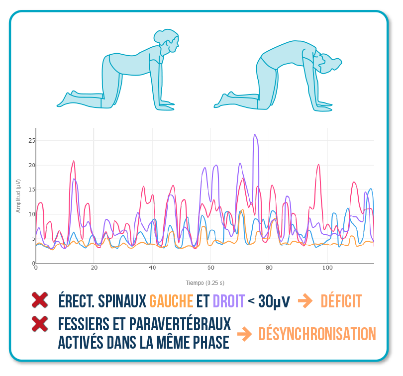 Objectif : identifier une faiblesse fessière et un excès de coactivation lombaire.