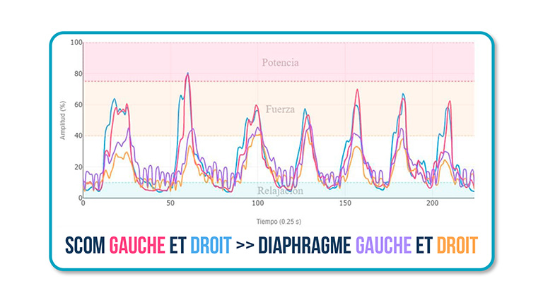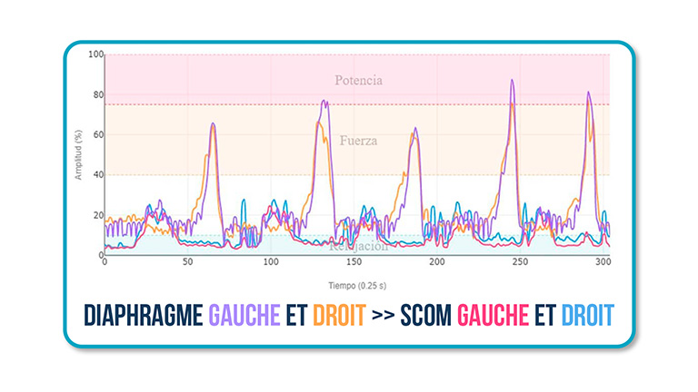 ✔️ Diaphragme gauche et droit >> SCM gauche et droitCela indique que le mouvement respiratoire provient de l’abdomen, avec une implication cervicale minimale, garantissant une respiration efficace et sans compensations.