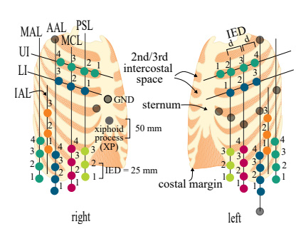 Place les électrodes sur les lignes médioclaviculaires, à 2,5 cm au-dessus du bord costal. Cela permet de capter l’activité diaphragmatique sans interférences abdominales.